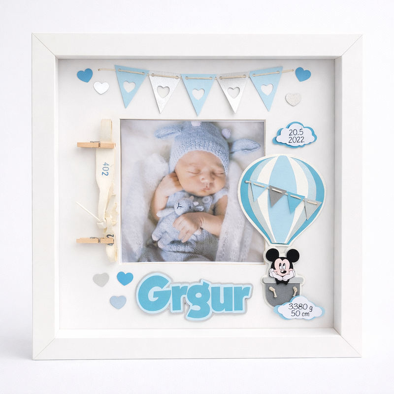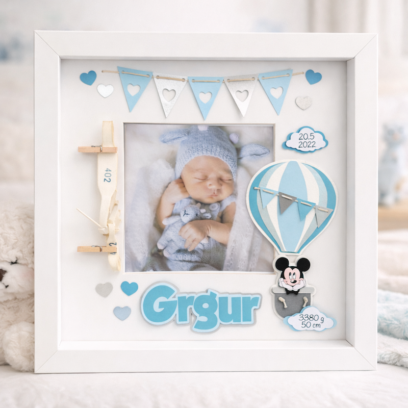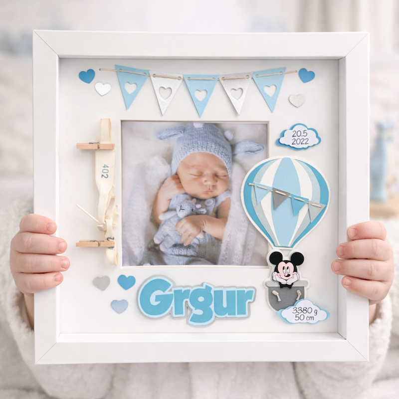 personalizirani okvir za fotku i Äuvanje narukvica iz rodiliÅ”ta s motivom Mickeya Mousea u balonu