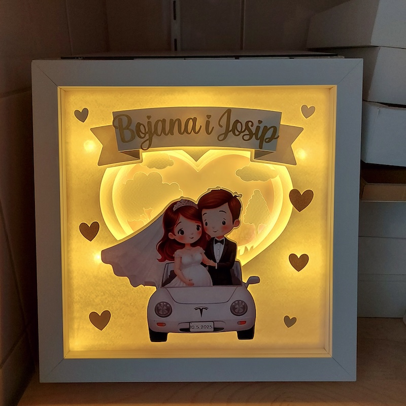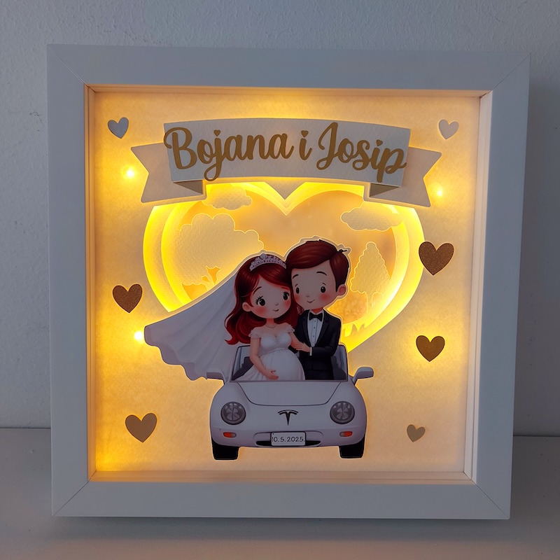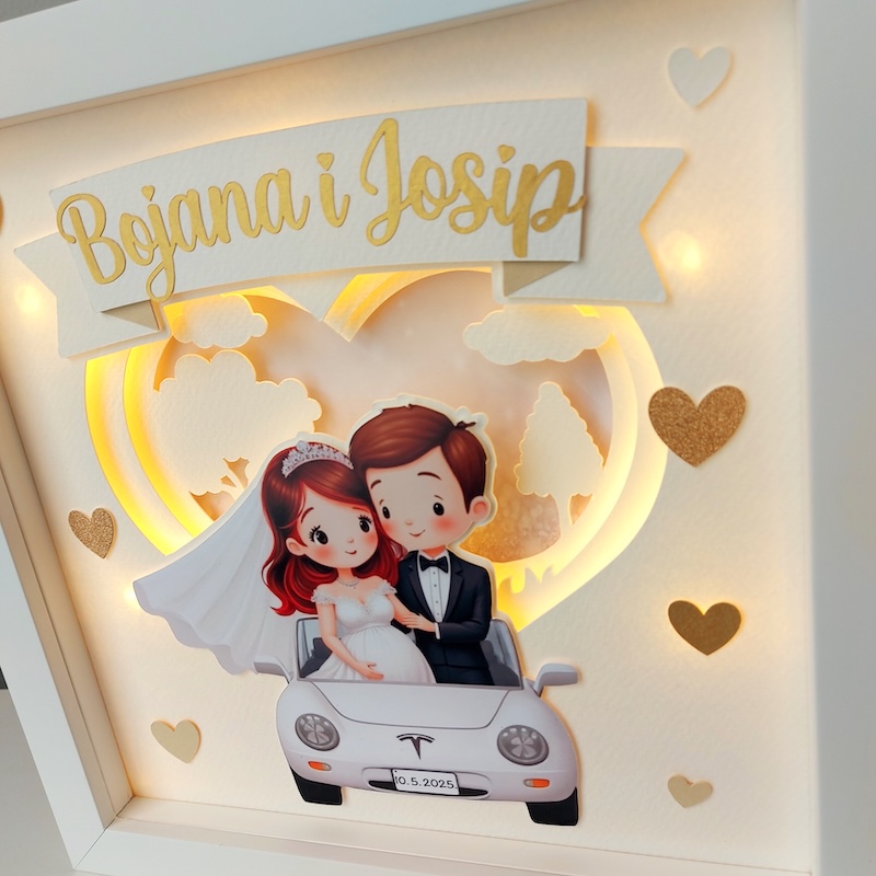 personalizirani 3D okvir s lampicama s imenima, datumom vjenčanja i likovima koji nalikuju sretnom paru